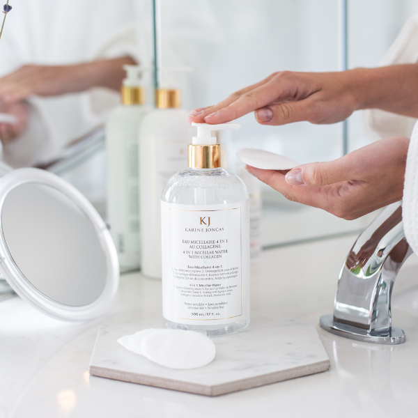 L’Eau Micellaire 4 en 1 au Collagène nettoie la peau en profondeur et élimine en un seul geste toute trace de maquillage sur le visage, les yeux et les lèvres. Riche en collagène, en extrait de concombre et en acide hyaluronique, ce nettoyant express tonifie et défroisse la peau, tout en procurant un effet « fermeté».