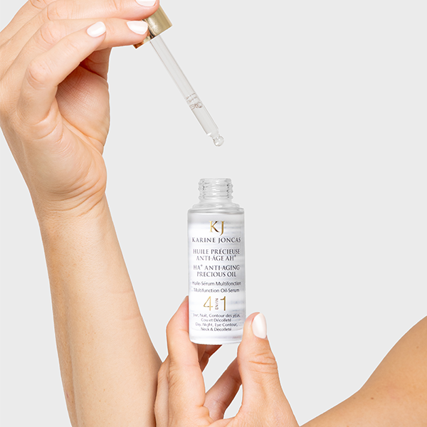 L’Huile Précieuse Anti-Âge AH+ est le soin correcteur nutritif par excellence pour une action anti-âge complète. Formulée avec de l’acide hyaluronique, du squalane, des huiles précieuses d’argan et de jojoba, cette huile-sérum aide à combler l’apparence des rides, tout en nourrissant intensément la peau. Elle procure un effet fermeté intense et diminue l’apparence des taches ainsi que des rougeurs d’origines variées. La peau paraît rapidement plus éclatante, lisse et souple. Régénère et protège la barrière d’hydratation de la peau. Texture légère et non grasse.